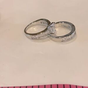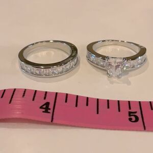 Beautiful silver heart shaped main stone with channel set square cut cubic zirconium in main band and second band. Together they make a beautiful set. Size 7