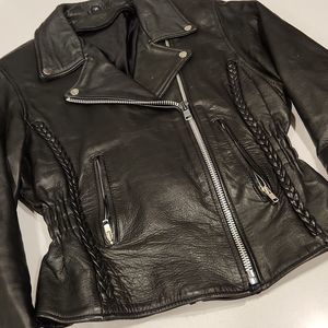 Gorgeous black leather motorcycle jacket size M with braided detail!