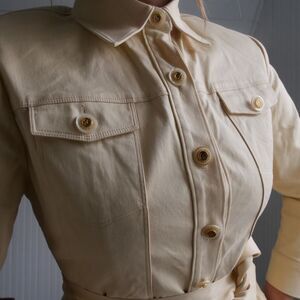 Light slightly stretchy 70% cotton 28% polyamide 2% Lycra blend, SJ buttons throughout, 4 pockets, original belt, nice tailored fit, easily removed small shoulder pads, longline
