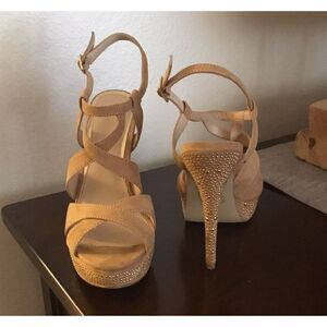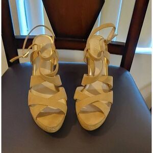 These high heel sandals are gorgeous! They have only been worn once and are in excellent condition. Done in a tan faux suede, these strappy sandals are embellished with gold studs on the front platform and heels. They have a 5” heel height and are size 8M.