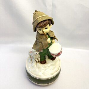 Celebrate the spirit of the holiday season with this mid-century music box featuring a sweet figurine of a young boy in a hooded cloak playing a drum, accompanied by a gentle white lamb.