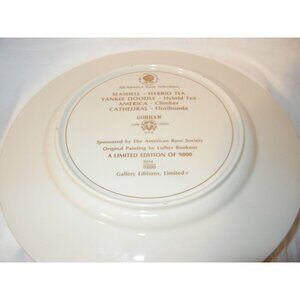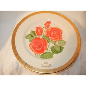 Gorham ALL AMERICAN ROSE Seashell Collector Plate, 1976. It is in excellent condition for its age. It is free of chips, cracks, and stains, with no crazing visible. There are four rub points around the underside of the rim. It has a diameter of 10.5. It's a lovely piece.