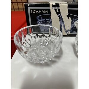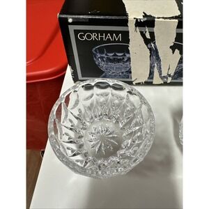 The Gorham Crystal Cream and Sugar Set is a vintage set consisting of a round-shaped creamer and sugar bowl made of clear crystal. Produced in Germany, this elegant glass set bears the Gorham brand and is an original piece, unboxed and featuring a printed backstamp. With a classic design, this creamer and sugar set adds a touch of sophistication to any dining or tea service.