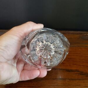 Measures approx 5.5" tall and is made of heavy clear glass.