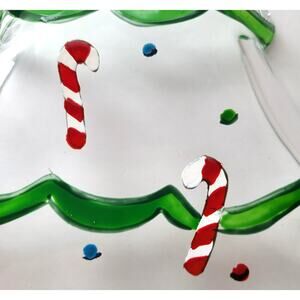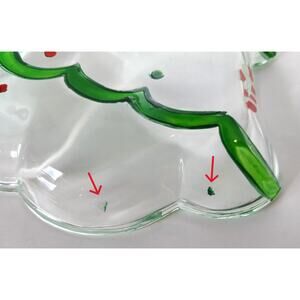 Gorham "Winter Follies" glass candy dish with moveable, sitting Santa is approximately 10" long x 8" wide and 1.25" tall. Hand painted glass ("a unique product is created with each brushstroke") so imperfections happen (see photo 5) and no two pieces are exactly alike. The 3" tall resin Santa figurine can be placed on any spot along the edge of the dish. Hand wash only - not safe for dishwasher. Comes with original box. In like new condition with no chips, cracks, or stains. There looks to be some very small paint smudges on the back bottom right (photo 5), but I believe these are just due to the nature of the hand painted technique used.