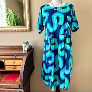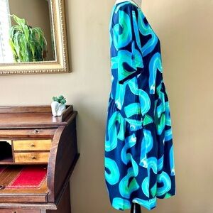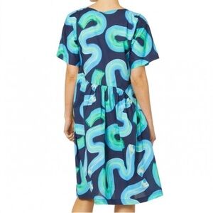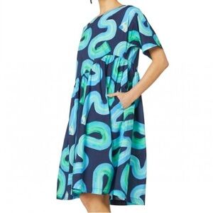 Gorman Swirl Cotton Smock Dress Blue Green Short Sleeve Asymmetric Waist 6 NWT