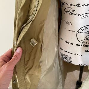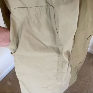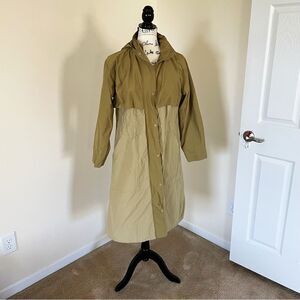 This very stylish trench/ rain/ utility coat is in excellent used condition. No flaws. Hood can be stowed in the collar. Waist is adjustable. Deep pockets and long enough to wear with dresses and skirts. Let me know if you have any questions!