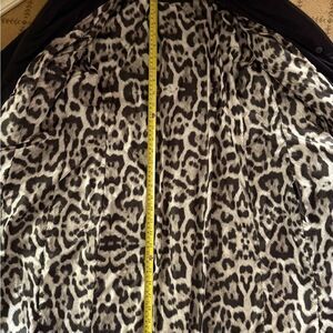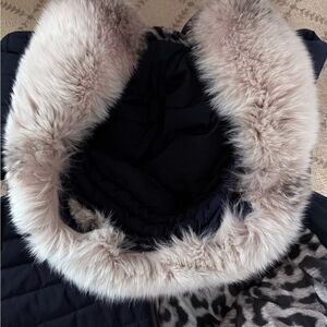 Gorski Apres-Ski jacket with detachable dyed Blue Fox fur (Finland) hood trim. Leopard lining.  Gently Pre Worn condition.  some minor scratching on hardware.  No rips stains or tears.   No belt included. Retails for $1500+