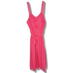 Vintage 60s Gossard Artemis Coral Gown with Waist Tie Floral Stitching appliques. Sheer wide straps Midi length. 100% Nylon.