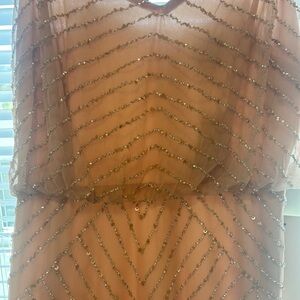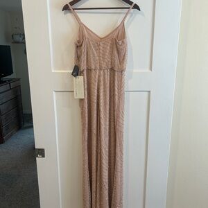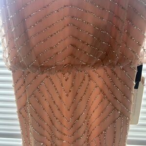 Blush pink, with crystal like beads. Perfect for prom or brides maid dress!