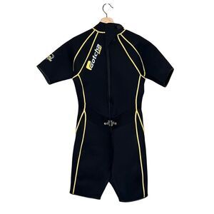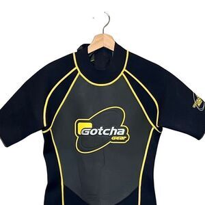 Gotcha gear black titanium 2 short neoprene wetsuit size men’s medium. Zipper back with adjustable Velcro closure. 4 way stretch. Very good condition. 80% neoprene 20% nylon. Length 37” Chest 18” Waist 14.5”.