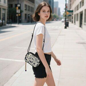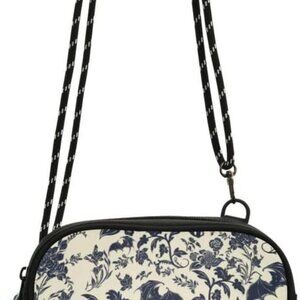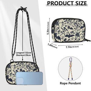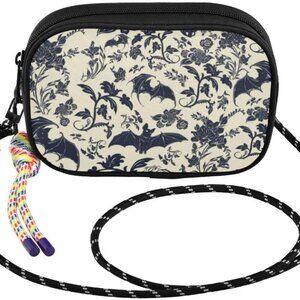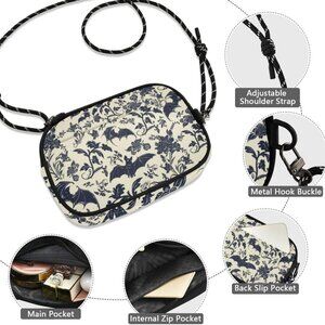 Features: Compact crossbody purse made from easy-to-clean polyester with a playful goth bat print. The size is perfect for holding your essentials like credit cards, cash, keys, and headphones. Features an adjustable removable strap, so you can wear it as a crossbody or clutch.