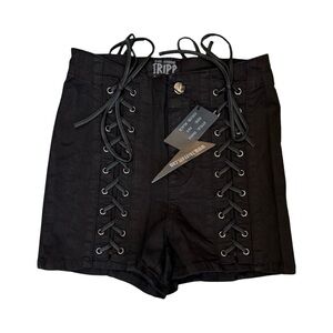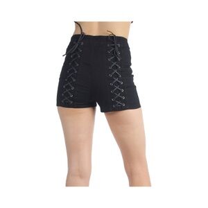 Introducing the Stylish TRIPP NYC Women's High Waisted Double Lace Up Shorts, designed to make a bold statement while offering supreme comfort. Crafted from a stretch denim blend (97% cotton, 3% spandex), these shorts ensure a flattering fit that accentuates your silhouette.
