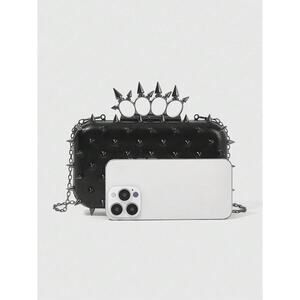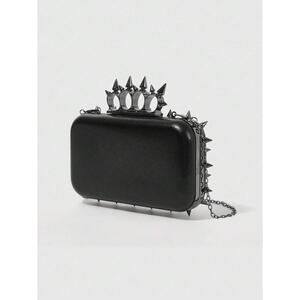 Unleash your bold style with this edgy black gothic clutch bag, featuring a knuckle duster-style handle adorned with chrome spikes. Designed for those who dare to stand out, this statement accessory is perfect for concerts, club nights, or punk-inspired fashion looks.