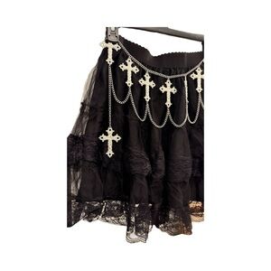 Elevating its Gothic essence, a striking silver-toned cross chain accent gracefully drapes around the waist, adorned with multiple intricate silver crosses interlinked by delicate chains. This bold detail infuses the skirt with a rebellious, heavy rock aesthetic, making it a standout piece in any Gothic wardrobe.