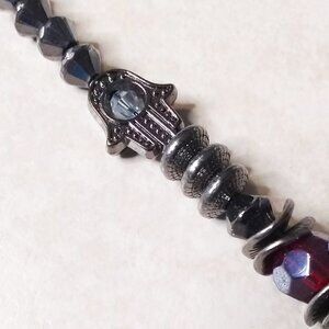Most of my Hamsa Hand or "Hand of Fatima" Blessing bracelets are in upbeat and vibrant colors. This one??? Not so much - for whatever reason I was on a goth inspired trip when I made this bracelet and choose mostly darker colors for it. This is all in dark grays, gunmetal black, black and accented by deep dark red beads and I used various glass and semi-precious stone beads to create it.