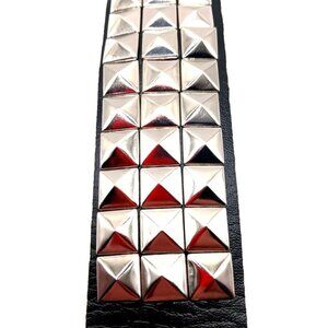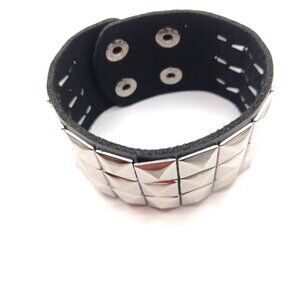 New withouttags-Unisex Gothic triple row square studded bracelet. Has 3 rows of silver color square studs - 12 per row. Measures 9 inches long and 2 inches wide. Fully adjustable with 2 snap closure. Color is black-made of vegan leather