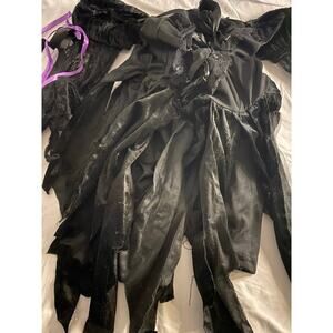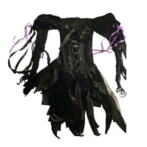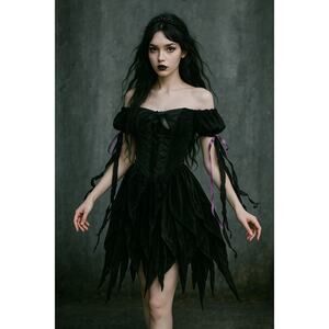 Channel dark fairycore vibes in this stunning gothic-style black dress. Featuring a corset lace-up front, off-shoulder puff sleeves, and flowing tattered layers of velvet and satin for a dramatic witchy look. Perfect for Halloween parties, cosplay, gothic festivals, or alt fashion shoots. Gently pre-loved and ready for its next spellbinding moment.