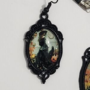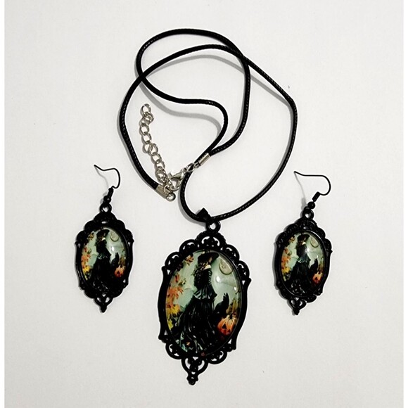 Goth Witch Portrait Necklace & Earrings Cabochon Pendant Corded Photo Glass Dome