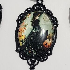 This Witch Portrait Cabochon Pendant Corded Photo Glass Dome Necklace & Earrings set is perfect for those looking for a gothic-inspired accessory. The oval pendant features a cabochon photo of a witch portrait, making it a unique and eye-catching piece. The multicolor exterior and lobster closure add to the overall aesthetic, while the adjustable cord ensures a comfortable fit. Pair this necklace and earrings set with your favorite outfit for a touch of Halloween charm.