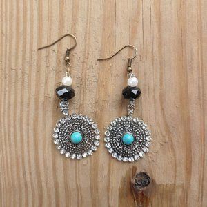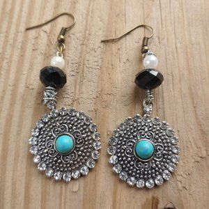 Goth black, white, and turquoise dangly earrings