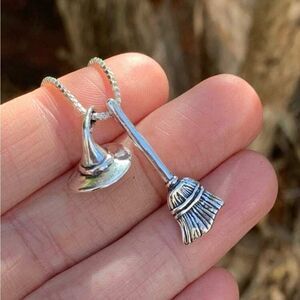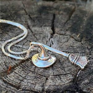 Gothic Cottagecore Withcy Hat and Broom Necklace beautiful silver color, Engraved details and design. Perfect simple feminine design that would look amazing with any outfit. Great Layering addition piece!