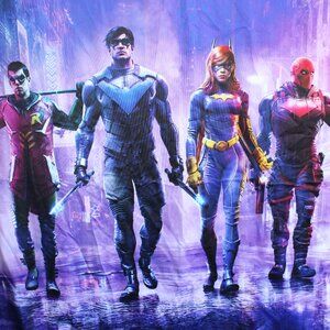 The Gotham Knights Fabric Promo Poster is a promotional signage for the video game series Gotham Knights, featuring characters such as Robin, Nightwing, Red Hood, and Batgirl. The poster is made of fabric and measures 7 feet by 4 feet. It is part of the Batman product line and was manufactured in 2022.