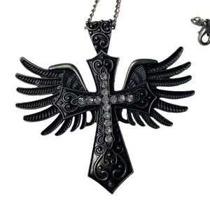 This Gothic winged cross pendant necklace exudes a vintage charm with its intricate design and dark, antique finish. The detailed wings and cross add a unique character, making it a standout accessory for any collection.