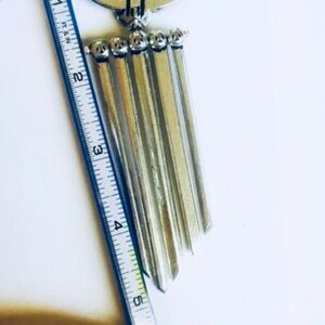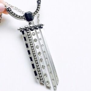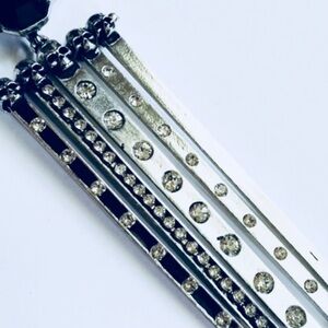 Stunning display of Art Deco Decadence. This sleek yet sensual piece showcases an impressive display of magnificent old time glamour. The articulated penduli are generously encrusted with Swarovski crystals, as is the stunning gorget. Handcrafted in England of fine English pewter and Swarovski Crystals with touches is artful enameling. This is a retired/rare piece, which will only become more collectible and treasured. Priced firmly. Attached chain and pendant are 16” across. $120. Unisex.