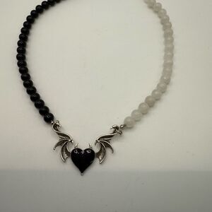 Keywords: gothic bat necklace, winged heart pendant, black white beaded choker, alt Y2K jewelry, emo bat necklace, vampire bat necklace, gothic cosplay necklace
