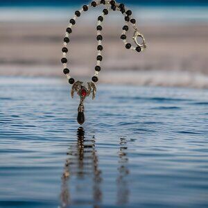 Here is a new 'BAT' winged dragon looking necklace pendant. Onyx beads. Handmade. New 20 inches.