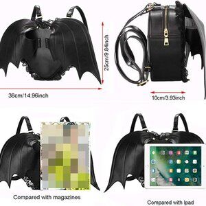 Features: Adorable heart-shaped backpack with bat wing details and lace embellishments. Made from soft faux leather, with multiple pockets including a large main compartment, slot pockets, and anti-theft zipper pocket. Adjustable, removable shoulder straps for a perfect fit, ideal for your daily carry or spooky season looks.