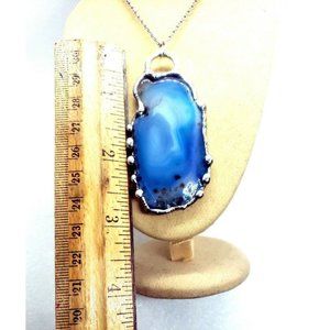A brillant and amazing polished blue & white dyed agate crystal gemstone crafted into a beautiful renaissance / medieval pendant that is also very unique and has been hung from an 18" gunmetal chain.