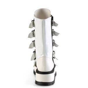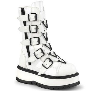Gothic 2" Platform Buckle Up Boots. Mid Calf Design. Featuring 5 Buckle Straps with Metal Triangle Rings. Outside Zipper Closure. Faux Leather.