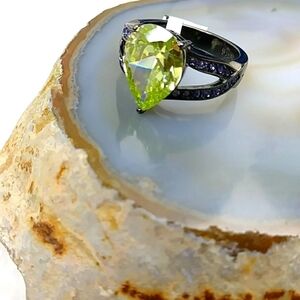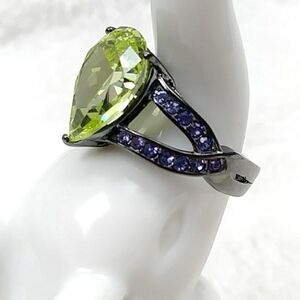 Stunning Stainless Steel Cocktail Ring in a Dark Gunmetal Band, Teardrop Simulated Peridot Center Stone with Purple Rhinestone Accent Stones. Beautiful Shiny Sparkle, Set in High Quality Hypoallergenic Stainless Surgical Steel which is a Durable Metal, No Easily Bendable and Will Not Turn Your Finger Green. High Quality Costume Jewelry Piece. Style Profile: Gift idea, new with tags Jewelry, Women's Ring, Peridot, August Birthday, Birthstone. Smoke Free Home, Fast Shipping!