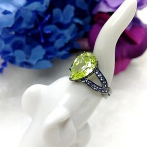 Stunning Stainless Steel Cocktail Ring in a Dark Gunmetal Band, Teardrop Simulated Peridot Center Stone with Purple Rhinestone Accent Stones. Beautiful Shiny Sparkle, Set in High Quality Hypoallergenic Stainless Surgical Steel which is a Durable Metal, No Easily Bendable and Will Not Turn Your Finger Green. High Quality Costume Jewelry Piece. Style Profile: Gift idea, new with tags Jewelry, Women's Ring, Peridot, August Birthday, Birthstone. Smoke Free Home, Fast Shipping!