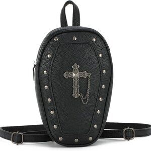 Features: Compact coffin-shaped bag with a unique gothic vibe, perfect for adding a touch of edge to any outfit. Features a convertible strap so you can wear as a backpack, shoulder bag, or crossbody. Spacious enough for keys, phone, wallet, and lipstick, making it great for Halloween parties or daily errands.
