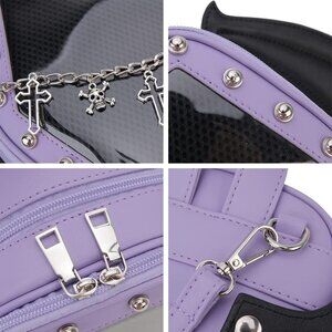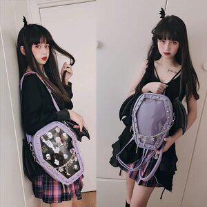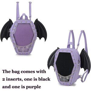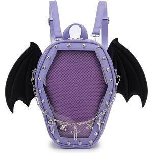 Material and Accessory Description: This coffin shaped backpack is made of Vegan Leather and great PVC . Smooth zippers, and metal decorative chain. The stitching is very clean and sturdy
