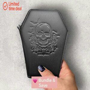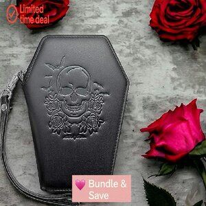 This compact, everyday wallet adds a touch of gothic charm to your essentials. Its structured coffin shape and practical design make it ideal for daily use, errands, travel, or special occasions.