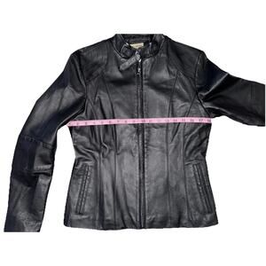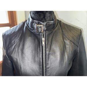 The De Coded Black Leather Biker Jacket in size Medium is a mid-length jacket with a solid pattern and long sleeves. It features a full zipper and buckle closure at the neckline. The jacket has slash pockets and is made of 100% leather, with a lining of acetate and polyester. It is insulated with polyester and is suitable for travel, party/cocktail, casual, and formal occasions.