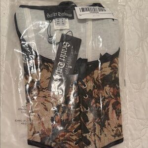 Stylish corset top with floral pattern and lace-up front. Features black ribbon details.