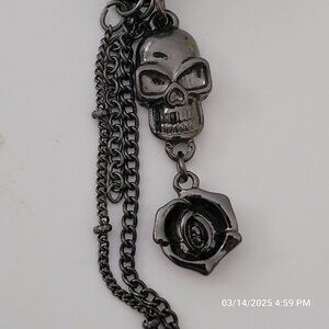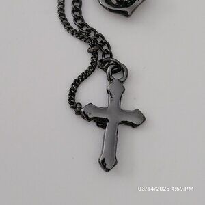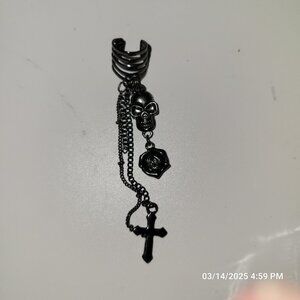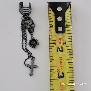 This product is a black gun metal cuff earring with a gothic theme. The earring features a skull shape and a rose dangle with cross. The closure is a wrap style and the earring is designed to fit snugly in the ear area. The item length can be seen in the pictures provided.