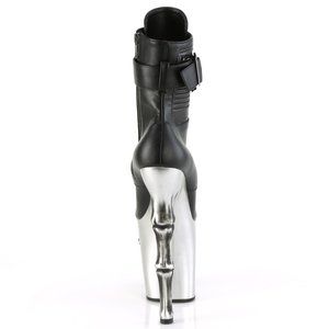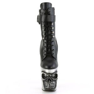 8" Skeleton Finger High Heel, 4" Gothic Skull Platform Lace Up Ankle Boots. USB Chargeable Red LED Lights with Multiple Static and Changing Patterns in the Eyes of the Skull and Back of Heel. Outside Zipper Closure Pocket. Inner Side Zipper Closure.