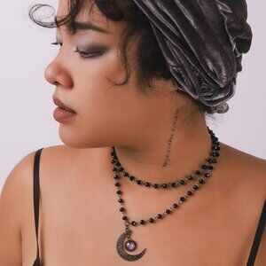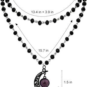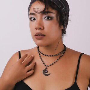 Features: This layered black bead choker features a striking crescent moon pendant, perfect for adding a gothic, emo touch to any outfit. Adjustable lengths make it easy to style for everyday or special occasions.