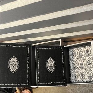 Set of two nesting notebooks with a gothic pattern featuring skulls and cats. Black and white design. 12” by 10” and 10” by 8”