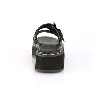 2" Platform Double Strap Slide Sandal. Riveted Straps and Ornamental Bat Buckles. Faux Leather.
