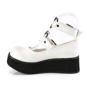 2 1/4" Platform Mary Jane Gothic Shoes. Dual Buckle Straps with Heart O Ring and Studded Detail. Vegan White Faux Leather.