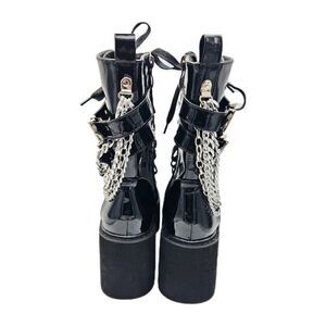 Gothic, Punk, Biker, Moto, Motorcycle, Platform, Wedge, Lug Sole, Combat Boots, Patent Leather, Silver Chain, Buckle, Goth Aesthetic, Y2K, Grunge, Emo, Rave, Concert, Festival, Edgy, Statement Piece, Hot Topic, Streetwear, Night Out, Clubwear, Durable