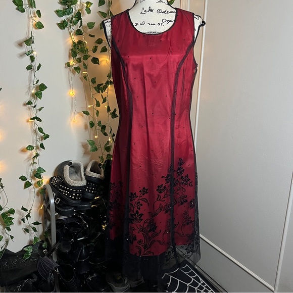 This gorgeous dress is giving major romantic goth vibes. It has a red base layer, which is very lightweight. The top layer is a black stiff mesh material. It features subtle polka dots, along with a gorgeous shimmery floral design along the bottom. Zipper closure in the back. This dress is wonderful for a more formal event, or for a dressed up daily piece!