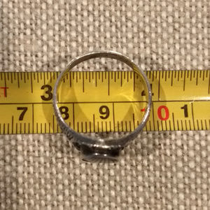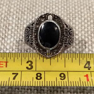Gothic Ring Silver Blacken. Broken onyx stone. Silver 0.925. Has some small lost stones. Approximate ring size is number 12 or 13, it has 21.9 mm inside diameter. The ring is worn and shows several scratches of normal use.
